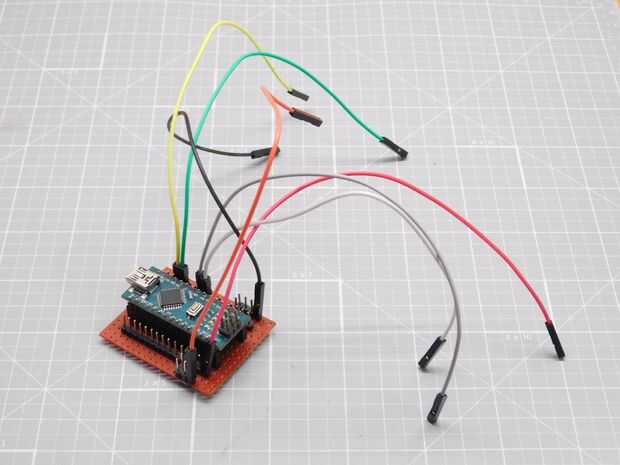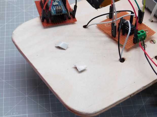 Después de hacer todas las conexiones, Monte su arduino temporalmente a parte vacante anterior de la base con cinta de doble cara. Antes de eso, debe asegurarse de que no hay tornillos ni piezas metálicas expuestas. Si sí, entonces todos ellos con alguna cinta de aislar antes de montar la placa. En caso de que usted está usando arduino Nano, puede que necesite un escudo o algo similar para hacer las conexiones con los cables del puente como en mi caso.