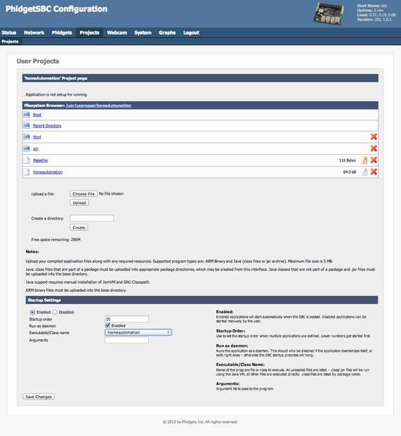 Ir a la interfaz web SBC. Proyectos y haga clic en el proyecto de automatización del hogar. En configuración de inicio, elegir el ejecutable homeautomation y lo habilite. Guardar los cambios.