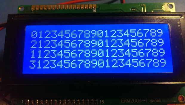 He puesto juntos un video de YouTube de las muestras de código imprime con una exhibición de carácter 2 línea 40 que imprime cada 4 líneas, 20 caracteres. Si usted tiene una pantalla LCD diferentes que las funciones de la biblioteca funcionará, que tenga que modificar la longitud del texto que desea enviar en el código de ejemplo.