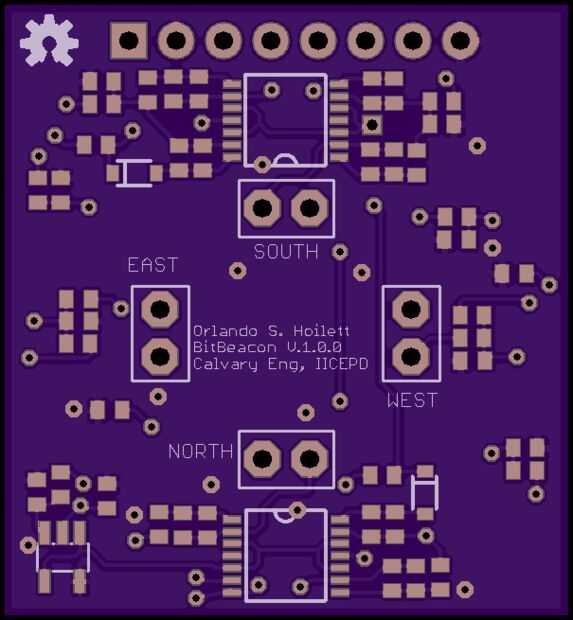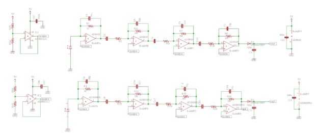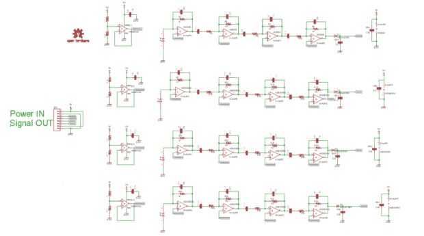 El diseño es bastante simple. Todos los cuatro sensores (norte, sur, este y oeste) utilizan el mismo circuito. La primera etapa es un amplificador de transimpedancia que convierte la corriente del fotodiodo (un fotodiodo es un componente que convierte la luz en corriente. Para una explicación más detallada de fotodiodos, vaya aquí.) a una tensión. Luego, hay tres circuitos consecutivos filtro bandpass con muy alta ganancia. Queríamos poder al control de broca de 15 pies lejos así que tenemos que amplificar la fotocorriente mucho para conseguir una señal utilizable. La etapa final (diodo y condensador) es un circuito de detector de pico. El circuito detector de máximo esencialmente nos permite convertir la señal de BitBeacon de CA a un voltaje de DC para el fácil procesamiento por un microcontrolador.