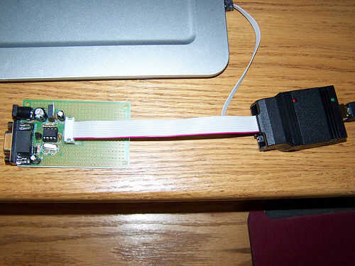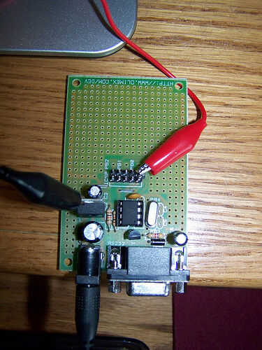 Por último, conectar un LED y el poder. El attiny puede ser conducido desde el ISP pequeño USB, pero esto todos del pin utilizado en la cabecera ICSP, y no he añadido cualquiera de los componentes a la zona de prototipos, todavía. Por lo tanto, utilicé una fuente de alimentación de pared de nueve voltios. Y para ser realmente eficaces, pinzas cocodrilo para conectar a tierra y el pin 0 a mi tablero de pan. Notó la seda de detección en las etiquetas de tabla Olimex los agujeros para el pin 0 (PB0), pero este pin no es el pin vecino en la cabecera ICSP.