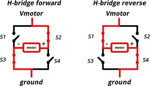 Para controlar la dirección de la rotación, la polaridad de la corriente suministrada al motor debe ser reversible; Esto se logra por el puente en H. Utiliza 4 interruptores que, cuando se enciende un par a la vez, cambia la dirección al movimiento deseado.