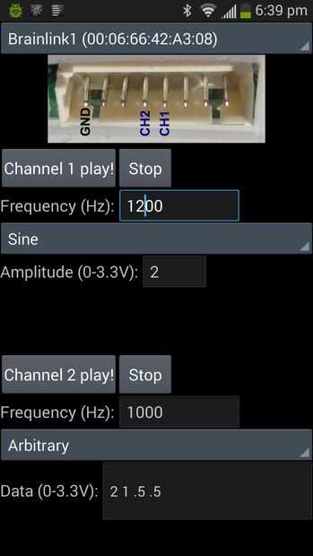 - Uso de ley de Ohm para que la corriente en los que desea generar los voltajes no excederá 20 mA, como pernos de Brainlink están clasificados sólo para 20mA. Por ejemplo, si usted se está conectando a una carga de 50 ohmios, asegúrese de que no hay tensión supera V=IR=(0.020) (50) = 1v. Si está conectando un 1 osciloscopio de mega ohm, no te preocupes.