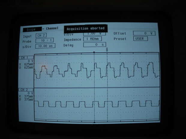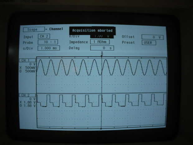 Limitaciones: El xmega se limita a 1,0 MS/s en modo Monocanal y 0.67 MS/s en modo de canal dual. Esto significa que el máximo teórico de un solo canal de onda cuadrada 500 kHz. En la práctica, aproximadamente 320 kHz es el más alto iría para una solo canal onda cuadrada y "cuadrado" es un poco exagerado (ver imagen). Para ondas sinusoidales, frecuencia algo más baja es mejor. Incluso a 100 kHz, una onda senoidal no ven muy bien, dado cómo pocas muestras tiene por período. Mis experimentos sugieren que operación de doble canal es generalmente mejor en 100 kHz y por debajo.
