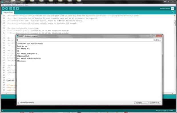 Encienda la placa Arduino y ejecute el monitor de serie, la cadena ' conectarse: ArduinoRover' debe aparecer (tal vez no para el tablero de Leonardo) si ya coincide con la velocidad de comunicación.