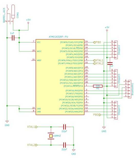 Hay cuatro partes principales en el esquema (que no sea el microcontrolador obvio): la alimentación, el oscilador de cristal, los controladores de motores paso a paso y el módulo de bluetooth.