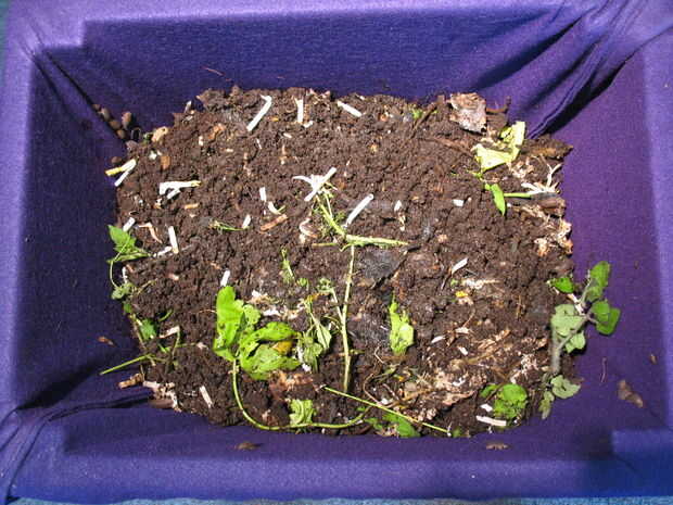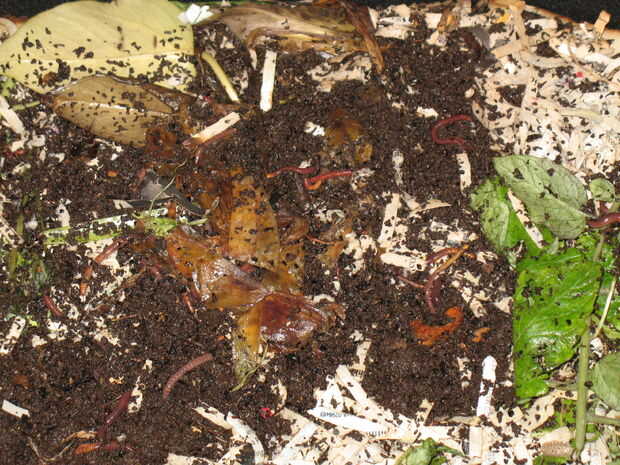 ¿Por qué no puedes ver gusanos en la parte superior en la primera foto? Porque odian la luz (la luz ultravioleta mata) así que ellos rápidamente enterrada abajo en la materia de alimentos para ocultar. Giré sobre el material y rápidamente tomó la segunda foto de detalle por lo que se podría ver. Tengo wiggler rojo gusanos o Eisenia Foetida, que son excelentes para situaciones de compostaje. No trate de desenterrar algunos aduladores común fuera de su patio para este tipo de compostaje, será infelices porque les gusta madriguera manera abajo en la tierra y no son felices como wigglers rojo de alimentación en la superficie del suelo.