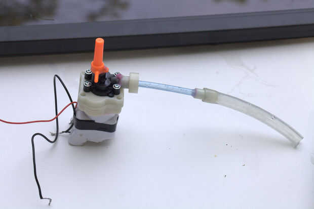 Era difícil de encontrar un pequeño motor DC que empujaría agua a un tanque de 15 pies del suelo a través de un tubo. Mayoría de las bombas pequeñas no tiene suficiente cabeza hidráulica para esta aplicación; es decir, no tienen suficiente empuje para mover el agua a través de un tubo de subida. Había unas cuantas bombas de venta online para uso de laboratorio que podría haber funcionado, pero eran caros. En primer lugar, tratamos de hacer nuestra propia bomba de un pino, el motor y el impulsor de plástico pequeños (desastre total). Luego, probamos acuario y bombas de la fuente de novedad (tienen tasas de flujo alto pero muy poca cabeza hidráulica). Luego, utilizamos la bomba dentro de un aparato de limpieza de los dientes WaterPik. No es una bomba tanto como un sistema de émbolo, pero es muy potente. El aparato bucal WaterPik funcionó bien por un tiempo, pero eventualmente quemado hacia fuera mi motor de la C.C. porque requiere demasiado esfuerzo de torsión. Por último, en una tienda de juguetes, hemos descubierto $10 pilas Super-Soaker Nerf pistolas de agua. Dentro de estos juguetes son bombas muy potentes con motores integrados.