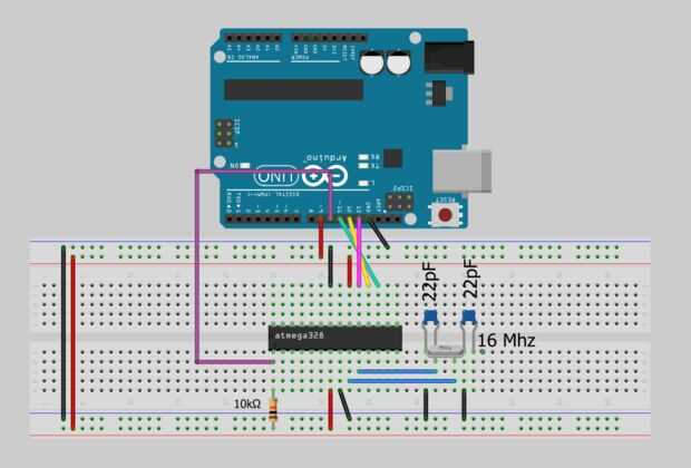 Un posible problema: como se puede ver el VCC para el Atmega en protoboard es alimentado por el pin Digital 9. Esto podría ser un problema ya que sólo puede suministrar tanta corriente a la placa. Por lo que no añade ningún otro circuito de lo contrario puede que no funcione. La VCC se conecta al pin 9 por lo que el código puede fácilmente reiniciar el microcontrolador para la programación.