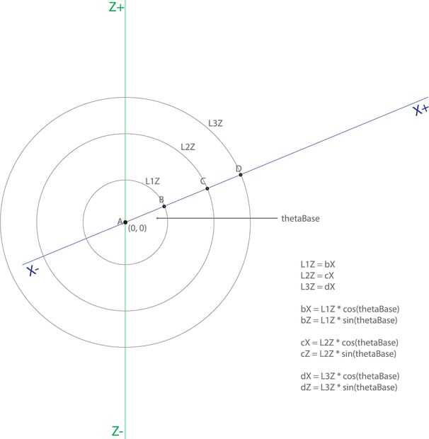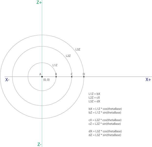 Mientras que el brazo solo se mueve a lo largo de un plano 2D, el base servo gira todos los puntos en espacio 3D. Para calcular las nuevas coordenadas de nuestros puntos comunes, tendremos que voltear nuestra perspectiva. Mirando desde arriba hacia abajo, el brazo se extiende positivamente a lo largo del eje X. Ahora tenemos un nuevo espacio polar donde el radio de los círculos para cada punto es igual a la coordenada X de cada punto en el plano XY. Simplemente lo redefinimos los valores de X como el coseno de thetaBase multiplicado por la longitud de L (N) Z (N es el punto que queremos encontrar. Podemos encontrar el valor Z multiplicando el seno del thetaBase por la longitud de L (N) Z. Con todo juntos, teniendo en cuenta ángulos thetaA, ficha y thetaC puede coordenada de encontrar el 3D de ahora del punto D. Con esto finalizamos nuestro simple matemática cinemática adelante. Ahora a ponerlo a utilizar...