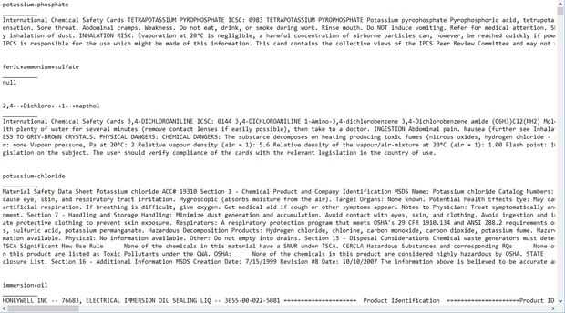 Básicamente, tenemos de entrada una lista de nombres químicos al programa y el programa pasa por cada uno de los productos químicos y encuentra una MSDS para él. Salida se verá como la imagen de abajo.