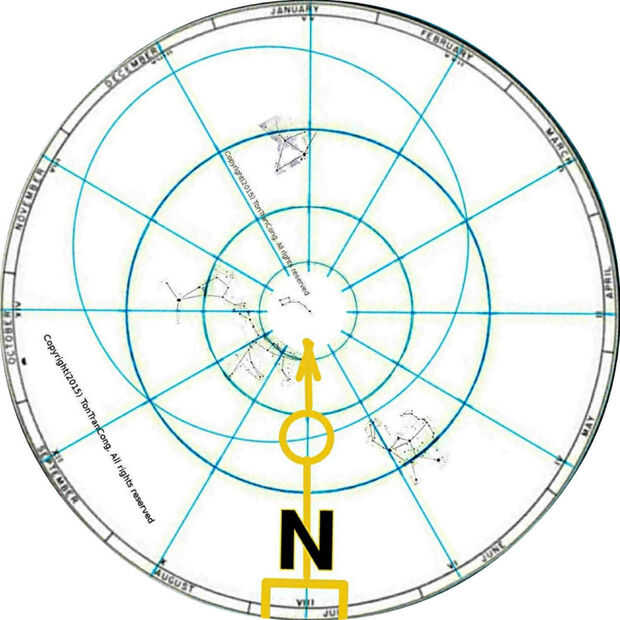Figura 1: Utilizando un mapa de estrella el 21 de julio, la fecha seleccionada está en el borde. Figura 2: Utilizando otro mapa de la estrella, obtenido a través de internet, en otra fecha, el 18 de enero, que está en el borde, justo debajo de la brújula. La mayor parte de este mapa descargado ha sido intencionalmente borrosa en esta ilustración por razones de derechos de autor.