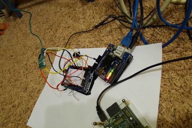 Para recibir el paquete sin hilos y comunicar los datos a la frambuesa Pi, necesitamos utilizar otros dos clones de Arduino Uno. Comprar un clon de Arduino Uno que tiene un 3, 3V / 5V interruptor, y que sólo lo ejecutarás a 3.3V. Están disponibles por unos 10 dólares en ebay. Uno Arduino será designado la "puerta de RFM" y la otra es la "puerta de enlace Ethernet". En la foto de arriba, puede ver la RFM entrada Arduino a la izquierda. Tiene el transceptor inalámbrico montado en él. A la derecha es la puerta de enlace Ethernet con cable ethernet conectado. Por debajo de los dos es el Raspberry Pi.