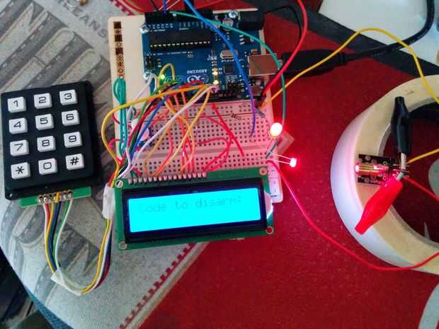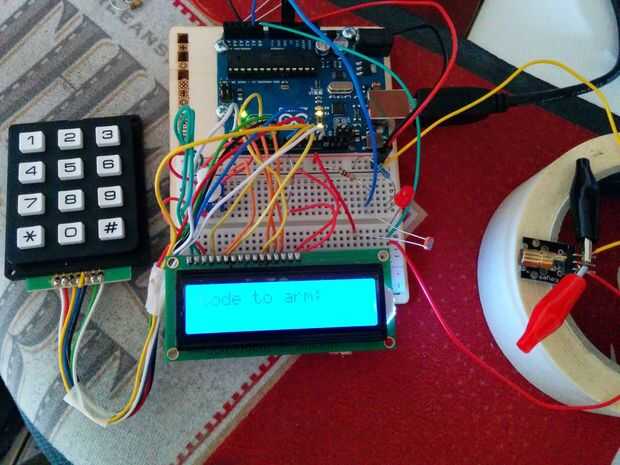 Después de conseguir éxito con armado/desarmado fui y cavado un sensor láser de mi caja de 37 en 1 sensor de cheapo y una fotorresistencia (un Resistor dependiente de luz, LDR para el cortocircuito). La LDR pasa a A1 con un resistor de 220 ohmios con una pierna y tomar su otra pata a tierra. El sensor láser va a la pata positiva del LED y a tierra. Ahora, cuando el sistema está armado el láser mueve en y se hace para que apunte a la LDR.