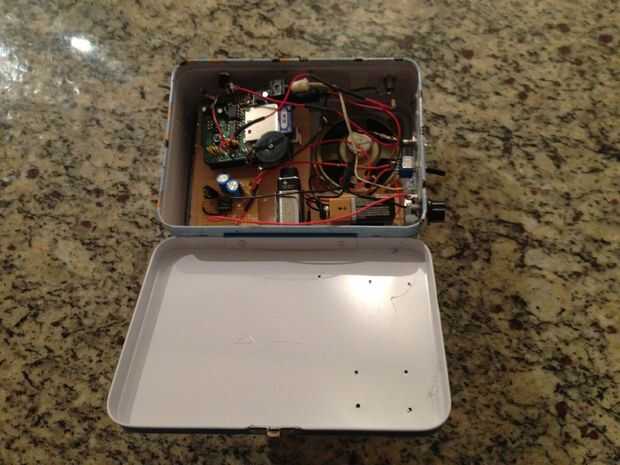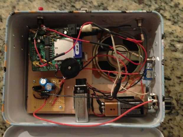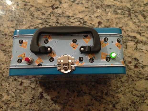 Lo que tenemos aquí es la caja de almuerzo de los Simpson que, cuando se presiona el interruptor rojo, jugarán al azar uno de 413 archivos wav que se almacenan en la tarjeta SD que se utiliza por el waveshield Adafruit.