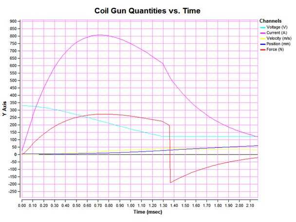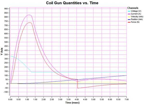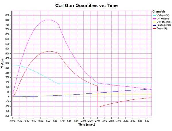 La pistola de bobina estándar 6 m m con los límites predeterminados de arriba le daría un máximo bruto de 33.5 m/s y 3.6J la energía cinética de 15 capas de 14AWG de 30 mm de longitud. El Banco de capacitores fue tan grande que este era evidentemente demasiado poder volcar en un proyectil tan pequeño en una etapa. El tamaño del proyectil era demasiado pequeño y un proyectil más grande era necesario. La gráfica de la simulación está por debajo de
