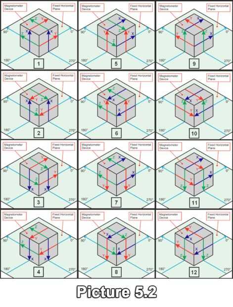 Coloque el módulo de magnetómetro (caja de calibración con el módulo adjunto magnetómetro) como se muestra en el cuadro 5.2.1 y haz clic en el botón "Punto 0" del "eje X + groupbox. Tenga en cuenta que la caja de calibración no esté parada relativamente fijo plano horizontal. Luego coloque el magnetómetro como se muestra en el cuadro 5.2.2 y haz clic en el botón "Punto 180" del "eje X + groupbox y así sucesivamente. Usted debe hacer de la siguiente manera (véase también el cuadro 5.3):