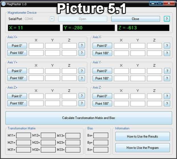 Ejecute MagMaster.exe y seleccione el puerto serie de la placa arduino. La cuerda verde en la ventana del programa indica las coordenadas del vector del magnetómetro (cuadro 5.1).