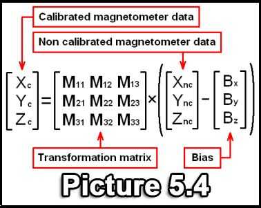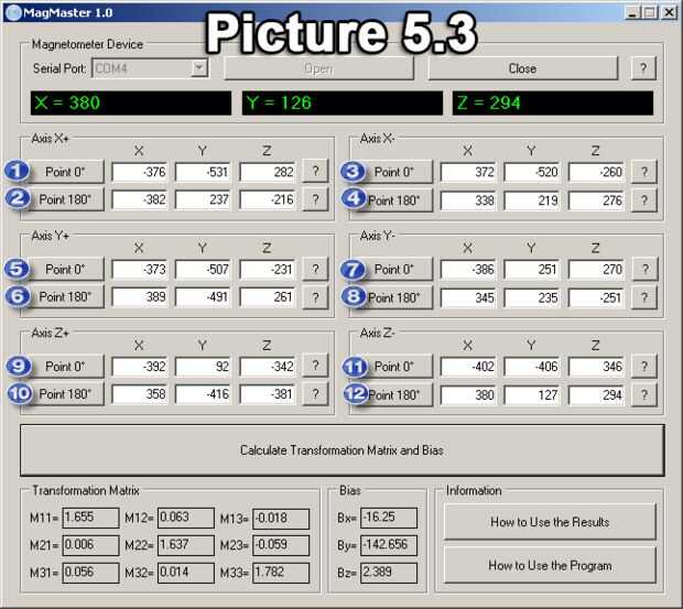 Para obtener las mediciones calibradas del campo magnético debe utilizar estas matriz de transformación y sesgo en su programa. Su algoritmo debe aplicarse el sesgo al vector de los datos del magnetómetro no calibrada (coordenadas X, Y, Z) y luego multiplicar la matriz de transformación de este vector resultante (cuadro 5.4). El algoritmo de C de estos cálculos puede encontrar en los dibujos de "Arduino_Test_Results" y "Arduino_Radius_Stabilization".