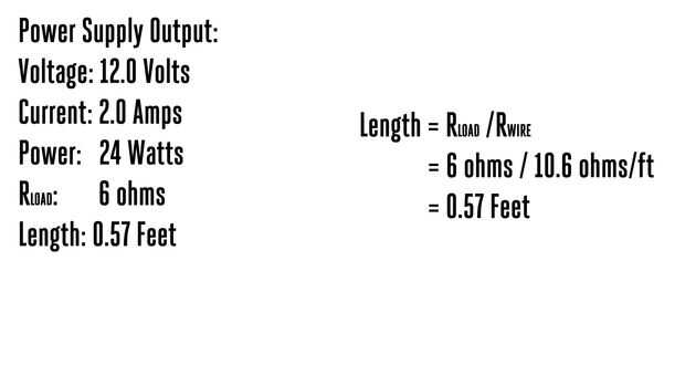 Primero calcular el grado del vatiaje de la fuente de alimentación al multiplicar la corriente (en amperios) por el voltaje de salida (ejemplo: 12V x 2.0A = 24 vatios). Al dividir la tensión de salida por la corriente (en amp) para obtener la carga resistiva (ejemplo: 12V / 2.0A = 6 ohmios). Ahora averiguar cuánto de un alambre que necesita hacer esta resistencia. Por ejemplo, un alambre de nicrom, con una resistencia de 10,6 ohmios por pie necesitará ser 0,57 pies (6,8 pulgadas) largo, tienen una resistencia de 6 ohms (6 ohmios/10,6 ohmios / pie = 0,57 pies). Por último dividir el grado del vatiaje de la fuente de alimentación por la longitud del cable para encontrar cuántos vatios por pie calienta el alambre (ejemplo: 24 vatios / pies 0,57 = 42,1 vatios / pie).