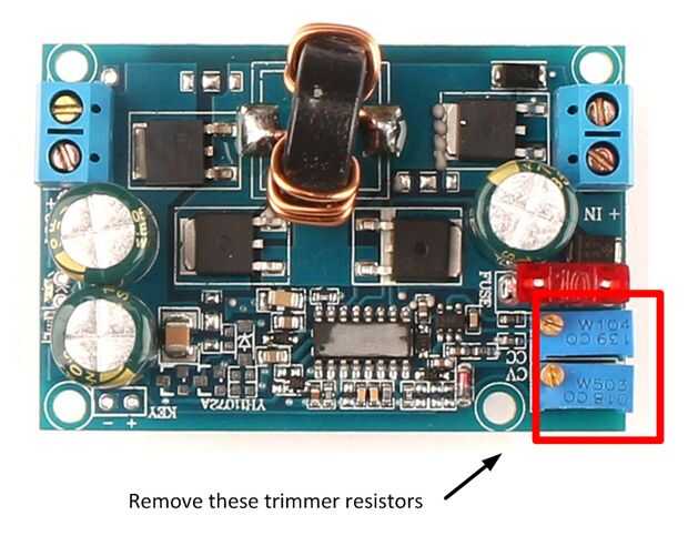 Ajuste de la tensión de salida y límite de corriente se logra con dos resistores trimmer multi vuelta. Para lograr estos ajustes para un potenciómetro en el panel frontal, es necesario quitar las resistencias trimmer. La forma más rápida de hacerlo es cortar cuidadosamente apagado del tablero con un par de cortadores de alambre. Esto puede parecer extrema pero la PCB es muy gruesa y las resistencias trimmer son suaves y fáciles de cortar a través. Cuando se quita el cuerpo de resistencia trimmer, habrá tres cables pequeño componente que se pueden fácilmente desoldered. Creo que este método es más rápido y resulta en menos posibilidades las almohadillas y los rastros se dañará de exceso de calor. Usé el método de corte y liberación en ambos convertidores sin problemas. Si tienes una vacío Estación desoldering alimentada por todos los medios darle una oportunidad. Empezar con convertidor DC-DC #1: