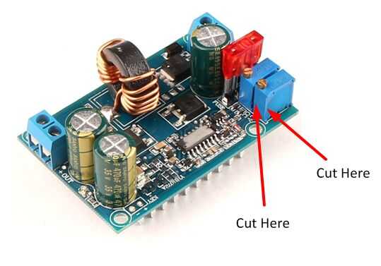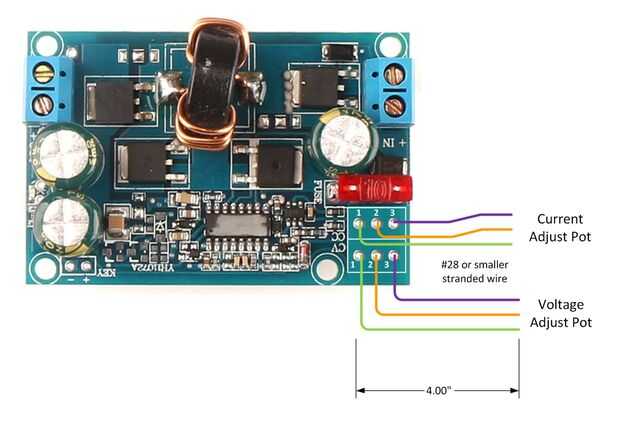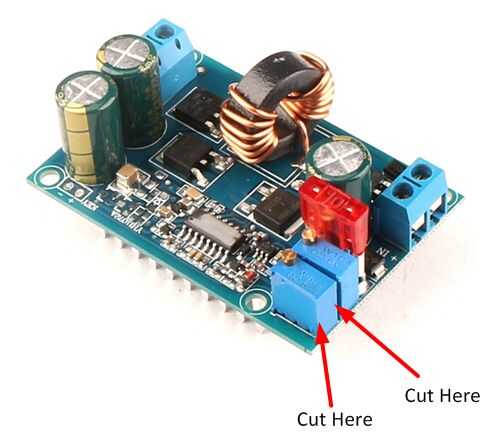 1. Observe que en cada tablero se indica el parámetro que se ajusta el resistor trimmer en letras blancas. En un papel en blanco, dibujar un esquema del tablero y toma nota de que altura es el ajuste de tensión (CV) y que altura es el ajuste actual (CC). En los convertidores de DC-DC utilizados para este proyecto, era el condensador de ajuste de tensión en la parte exterior de la Junta y la podadora actual estaba al lado del condensador de ajuste de tensión.
