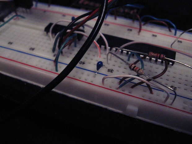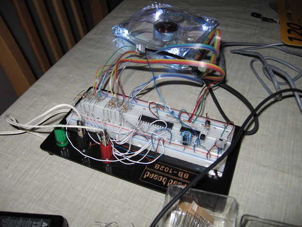 Conecte el motor del ventilador colocando una resistencia de 1K Ohm del Pin 5 (OC2B) a la base del transistor NPN. Conectar la clavija media del transistor a un resistor de 10K ohmios que luego se conecta a la base del transistor PNP. Conectar las patillas restantes de NPN a tierra, el centro de la PNP para el motor del ventilador y el restante de la PNP para su 12V (o lo que usas para una fuente de alimentación, breadboarded mina con un 9V porque tenía uno ahí, todavía suficiente para una prueba). Conectar toma de tierra del ventilador en el suelo de la placa, conecte el cable amarillo a un resistor de 10KOhm y también a una resistencia de 1KOhm. El 10KOhm va a + 5V mientras que el 1KOhm va a AVR pin 11 (T1). También poner 1uF entre pin 11 y suelo para suavizar la señal.