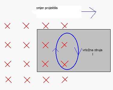-Las corrientes de Foucault ocurren debido a la inducción de campo variable de voltaje en el circuito del conductor (bobina) y puesto que el proyectil está hecho de hierro (conductor de corriente eléctrica) a continuación, convierte la corriente inducida de energía del campo magnético en el calentamiento del misil. (imagen de arriba es ilustrado proyección de corrientes de Foucault)