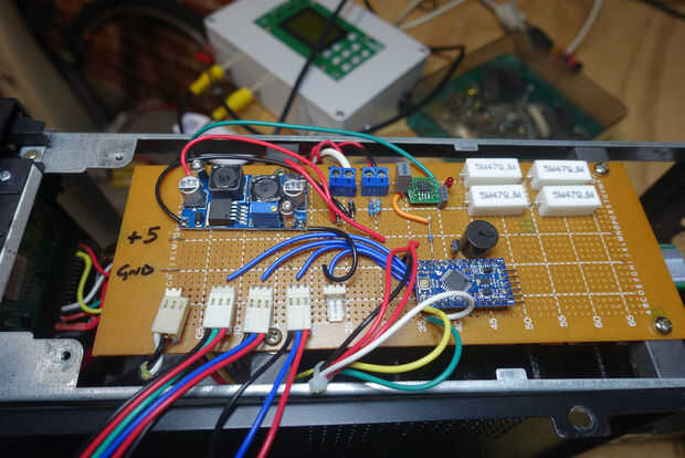 3) controlador de puerta MOSFET MIC4452YM (montado en un mini PCB - mini SOIC PCB ). Un resistor 10 de k tiene la clavija de salida digital en la baja de Arduino.