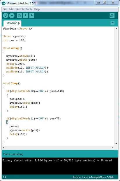 #include <Servo.h> Servo myservo; int pos = 100; void setup() { myservo.attach(3); myservo.write(100); delay(1000); pinMode(12, INPUT_PULLUP); pinMode(11, INPUT_PULLUP); } void loop() { if(digitalRead(12)==LOW && pos<=140) { pos++; myservo.write(pos); delay(150); } if(digitalRead(11)==LOW && pos>72) { pos--; myservo.write(pos); delay(150); } }