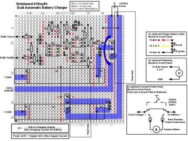 - Punto de prueba de corriente: Además puede Agregar un punto de prueba al circuito de carga que permite medir la corriente durante la carga de la batería. Esto es muy útil para pruebas y afinando en el dispositivo. Cada batería necesita un interruptor DPDT que puede manejar DC 15V 5A, y un par de conectores de banana. En la esquina inferior derecha se puede ver la funcionalidad del interruptor. Cuando el interruptor está encendido, la corriente se dirige a los conectores banana que pueden ser conectados a un amperímetro. Esta forma de conexión le permite medir la corriente de carga real de la batería, que le ayudará a seleccionar la resistencia en línea que usted puede seleccionar (si existe). Tenga en cuenta que no me daba cuenta esta opción en mi build.