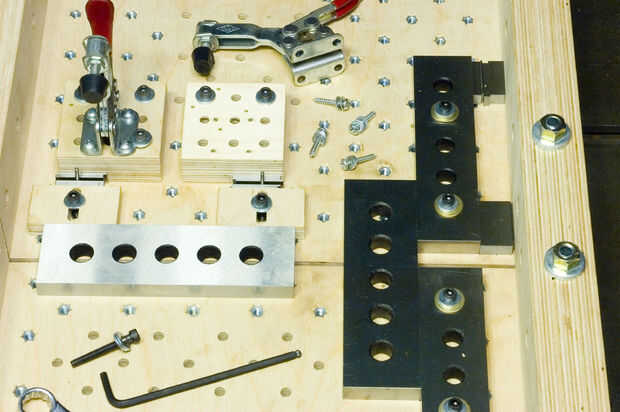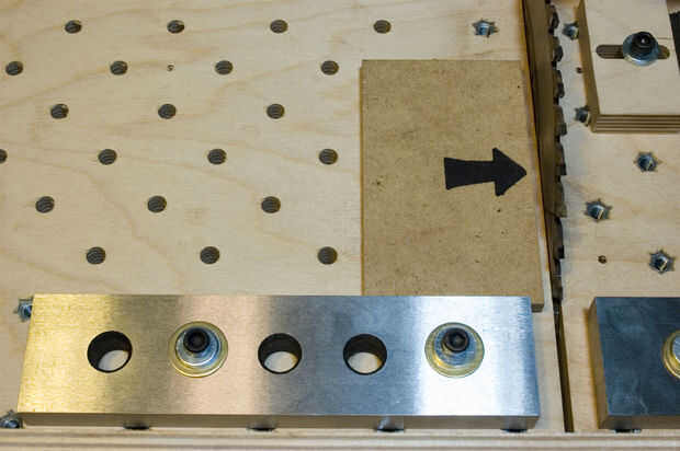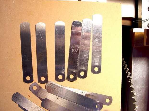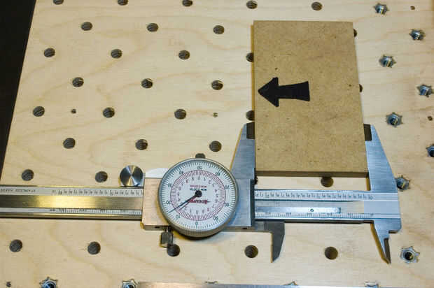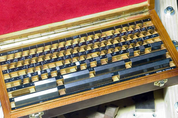 A través de ensayo y error puede alinear esta cerca secundaria exactamente perpendicular a la línea de corte mediante la colocación de un espesor variable de cuñas entre él y el respaldo Cruz apoyo. Si usted quiere conseguir las cosas en serio, te recomiendo conseguir un conjunto de bloques de calibrador del maquinista para tareas de diseño y calibración como esta. En el tiempo, usted puede simplemente cortar una cruda serie de espaciadores utilizando trozos de madera contrachapada. Para ajuste fino, puede Agregar pedazos de papel (0.003 grueso) o trozos de papel de aluminio (espesor de 0.001). Otra buena opción es conseguir un conjunto de cinco dólares de galgas automotriz.