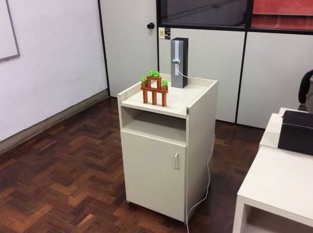 El objetivo es un kit de juguetes de Angry Birds. Para detectar que el objetivo fue alcanzado por el ave, una torre con un sonar Mida la distancia a la blanco. Si esa distancia es mayor que un valor predefinido, el sistema sabe que el blanco fue derribado.