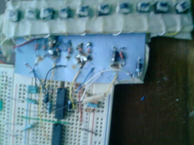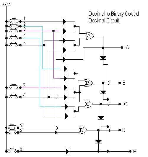 En otras palabras, para cada diodo se conecta y su funcionamiento al mismo tiempo, usted va a perder 0,65 V... que no sería un gran problema si nos quedamos sólo encender leds, pero estamos trabajando con el IC TTL, lo que significa que necesitamos por lo menos más de 2 V. Y como estamos empezando con 5 v... Significa que diodos de conecting 5 causará un fallo en nuestro circuito (el circuito integrado sería capaz de distinguir entre 0v y menos de 2v...) That´s por qué nunca utiliza más de 2 diodos en cada entrada... Nota: Usted debe conectar un resistor conectado a GND en cada puerta o entrada... Para resolver el segundo problema yo sólo agregar un diodo a cada ABCD y 0 y les conectado juntos, así que siempre que cualquiera de ellos es 1, tienes un 1 en "Press"(P). Ahora todos that´s izquierda es construir en el protoboard, o si quieres ahorrar algo más de espacio usted puede hacer como yo hice y algunos agujeros en un papel de construcción y soldar los diodos y los botones se... Si necesita más información sobre puertas lógicas: http://www.allaboutcircuits.com/vol_4/chpt_3/1.html si necesita más información sobre diodos: http://www.allaboutcircuits.com/vol_3/chpt_3/1.html