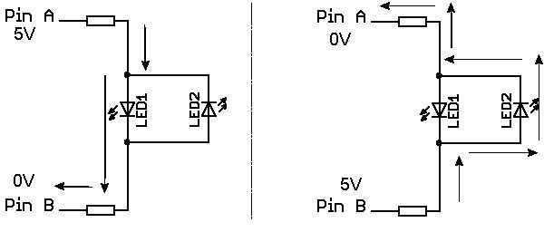 En la primera mitad del diagrama, el micro es salida 5V al pin y 0V al pin B. La corriente fluirá así desde A B. Porque está orientada hacia atrás para LED1 LED2 ninguna corriente fluirá a través de ella y no brillará. Es lo que se llama retroceso parcial. Tenemos el equivalente de la situación en la página anterior. Básicamente podemos pasar por alto el LED2. Las flechas muestran el flujo de corriente.