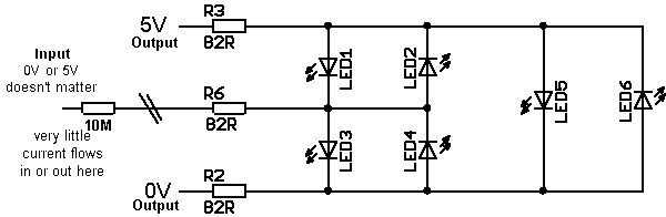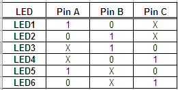 El segundo diagrama muestra los pines de la matriz para cada combinación posible iluminar cada uno de los 6 LEDs en nuestro ejemplo. Típicamente un tri-estado es denotado por una 'X', 5V se muestra como un '1' (para 1 lógico) y 0V como un '0'. En el micro firmware para un '0' o un '1' se programa los pines que una salida y su estado es bien definido. Tri-estado se programa para ser una entrada, y porque es una entrada que no sabemos en realidad lo que el estado puede ser... por lo tanto, la 'X' para el desconocido.
