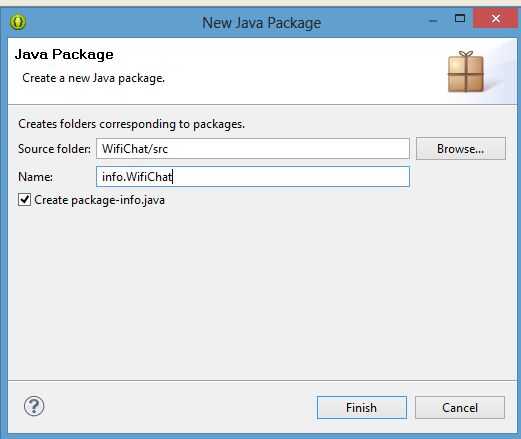Ampliar la Wifichat > JavaResources > fuente > Nuevo > paquete (el nombre como "info. WifiChat")