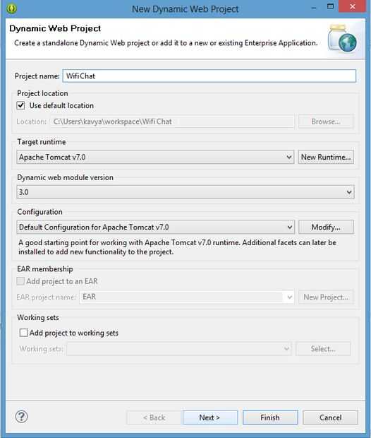 Archivo > Nuevo > Otros > Web > proyecto de web dinámica (nombre del proyecto "Wifi Chat")