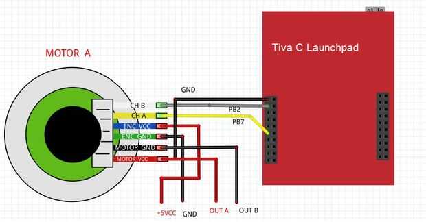 En esta sección, podemos ver la interfaz del codificador a Tiva C Launchpad y motores. Estamos utilizando codificadores para obtener la información de odometría robot.