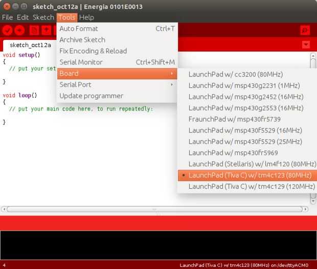 He usado IDE Energia al programa Tiva C Launchpad. Podemos utilizar este IDE para programa varios instrumento de Texas. El IDE es una versión modificada del IDE de Arduino y podemos programar el tablero usando el mismo lenguaje de programación que hemos utilizado en Arduino.