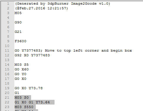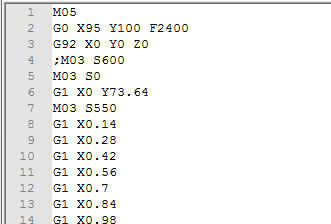 Los cambios se realizan rápidamente en Notepad ++ por lo que vale la pena hacer algunas pruebas con baja potencia sobre un trozo de cartón para obtener la alineación correcta antes de empezar a grabar en lo real.