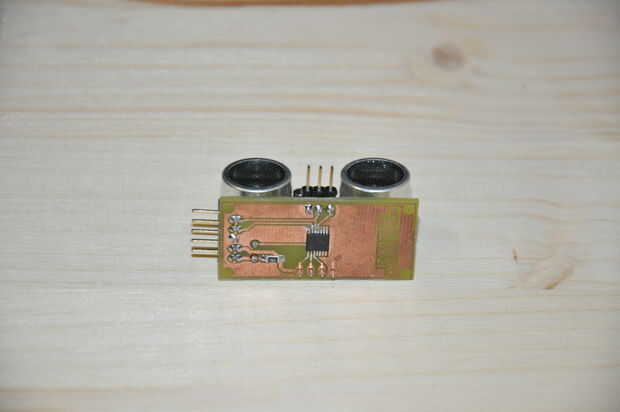 Lucky me, HC-SR04 cabe perfectamente en la parte superior de mi recinto. Perforar dos orificios, que amplió hasta, los apilados hasta que fui capaz de empujar las 'hablantes' por los agujeros. Porque estaba apretada sobre el espacio en esa zona, tuve que soldar el oscilador de la parte superior a la parte inferior. El inútil jefe del pin cuatro pin también fue librado de.