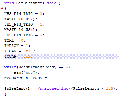 ¿Cómo podemos medir longitud de pulso usando un procesador? Con interrupciones externas. Utilizaré un flanco ascendente IOC para iniciar un temporizador y un flanco descendente para detenerlo. Los datos del registro nos dice que el tiempo transcurrido entre los dos bordes. Tenemos que, podemos calcular la distancia, según lo indique la hoja de datos.