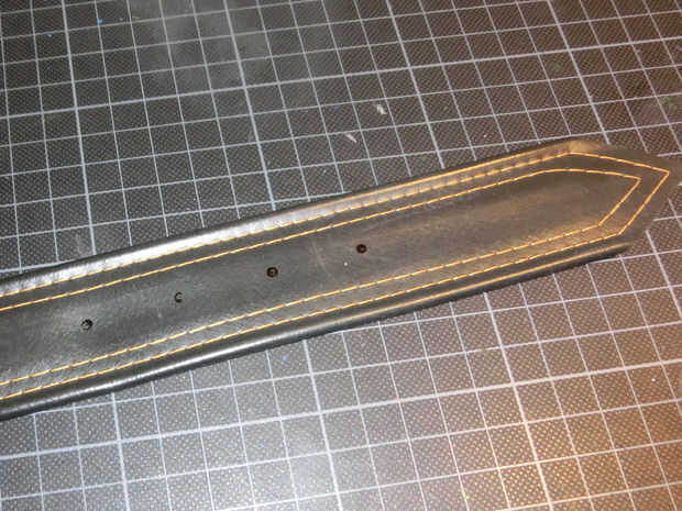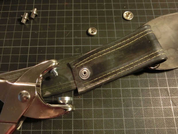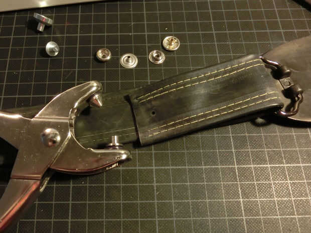 He utilizado Prym "Sport Mini" Presione los sujetadores, que funcionan realmente bien y no tuve ningún problema a la goma. Con el fin de darles algo extra de fuerza utiliza dos, pero uno debería ser suficiente. La quinta foto muestra cómo he marcado el lugar donde el sujetador en el otro lado tiene que ir. Sólo otro presione, que deja pequeña abolladura.