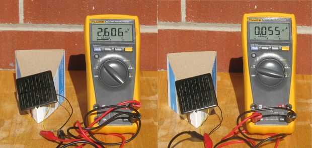 Las células solares son que menos afectadas por muertos cortos; mayoría de las células solares convertir menos del 8% de la energía del sol en electricidad. Si usted muerto corto una batería la corriente subirá hasta algo sopla, si usted muerto corto una fuente de alimentación la corriente va a subir hasta que algo se funde. Con una célula solar si se conecta el amperímetro a la celda sin carga, la corriente va a subir como una batería o una fuente de alimentación pero la corriente se detendrá una vez que alcanza el 8% de la energía del sol que sube. Eso no quiere decir que esto es seguro en todos los casos, sólo que algunas células solares no serán dañados por él.