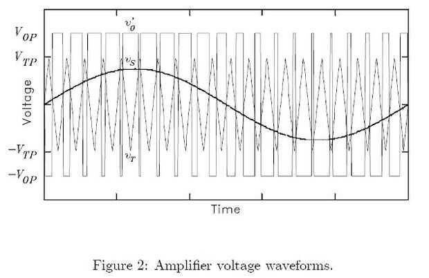 Figura. 2 muestra las formas de onda del circuito para el caso donde vS es una onda sinusoidal. Para fines de Ilustración, la frecuencia de la onda de seno es fS = 1 kHz y el triángulo de frecuencia de la onda es fT = 40 kHz. Para vS > 0, el ciclo de deber de los cambios de la onda cuadrada así que vo' pasa más tiempo en su nivel positivo que su nivel negativo. Esto hace que vo' a tener un valor promedio positivo. Del mismo modo, para vS < 0, vo' tiene un valor promedio negativo. La forma de onda para vo' se dice que es modulada de ancho de pulso. Cuando Vs es cero voltios, el ciclo de deber de Vo' se establece en 50%. El ciclo de deber de Vo' está cambiando según Vs.