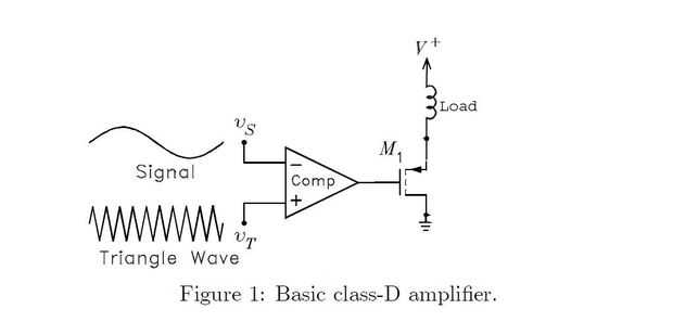 Amplificador clase D es uno en que los transistores de salida se funcionan como interruptores. Cuando un transistor que M1 está apagado, la corriente a través de él es cero. Cuando está encendido, el voltaje a través de él es pequeño, idealmente cero. En cada caso, la disipación de energía es muy baja. Esto aumenta la eficiencia, por lo que requiere menos energía de la fuente de alimentación y disipadores de calor más pequeño para el amplificador (Figura 1).