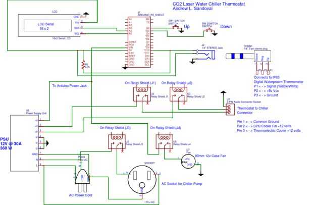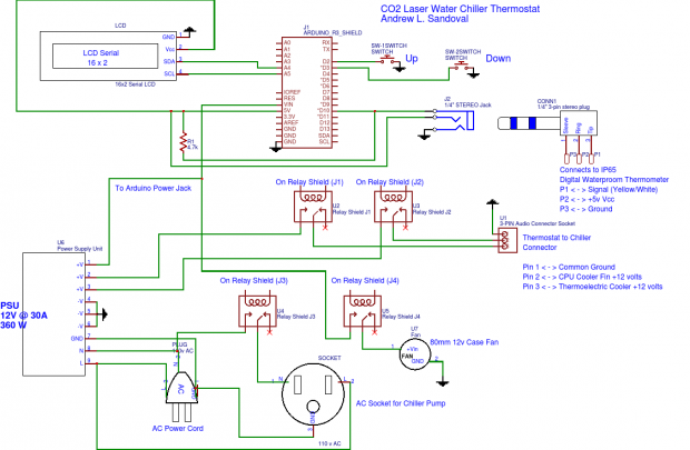 Como se puede ver en el diagrama esquemático, el circuito está construido encima de un escudo de Arduino y los lazos en el protector inferior de capas--el escudo de Seeed Studio relé. Para mantener todo modular, los componentes externos: el enfriador de agua y la sonda del termómetro están conectados a través de conectores de enchufe-puede, pero exactamente cómo se hace depende de usted. Podrán ver en las fotos cómo lo hice, y funciona bien. En el esquema, los relés se muestran utilizando las etiquetas de los relés en el escudo de relé. En todos los 4 casos el perno (N.C.) normalmente conectado no está conectado a nada. No es terriblemente importante que relé controla qué elemento pero es una buena idea para mantenerlos separados y le permitirá personalizar su dibujo para cambiar el calendario a sus necesidades.