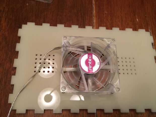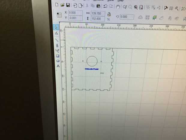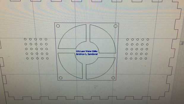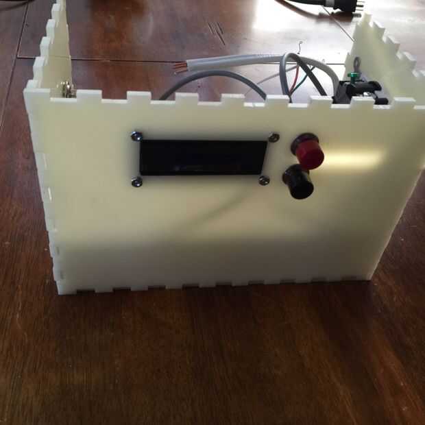 Mi caja de proyecto se hace de acrílico 3/16". El patrón de la caja fue hecho usando BoxMaker (http://boxmaker.connectionlab.org/). BoxMaker podrás entrar en sus dimensiones de la caja y el espesor y entonces producirá un archivo PDF que contiene cada panel. Mi cortadora láser es controlado por LaserCAD que no puede importar archivos PDF, por lo que fue necesario importar primero el archivo PDF en Inkscapey cada panel guardar como un archivo DXF. Los archivos DXF pueden ser importados en LaserCAD y luego se pueden agregar recortes para componentes externos frente a LCD, interruptores y ventilador en LaserCAD.