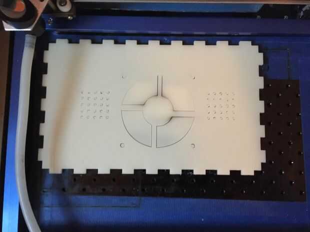 Si utiliza los archivos de .pwj5 adjunto con una cortadora láser capaz de LaserCAD hacer una nota de colores que se activan y las configuraciones de corte y ajuste según sea necesario. Porque hice el cuadro en varias pasadas, la configuración actual de la corte sólo refleja la última pasada. Hay un archivo para cada panel, así como un archivo para hacer la plataforma Arduino. También es muy importante tener en cuenta que algunas líneas marcan como las líneas de corte no están destinadas a cortar, pero en lugar de otro fueron significadas para alinear los orificios de los tornillos, etc.. Normalmente en los archivos de .pwj5 estos son, o el nivel de potencia del láser para que el color se establece demasiado bajo para cortar, generalmente ambos.
